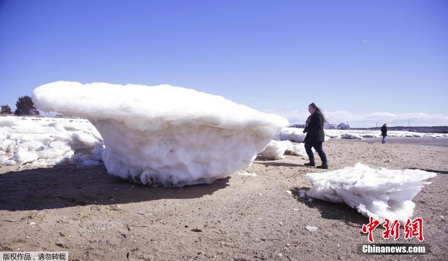 据外媒16日报道,冰山在美国马萨诸塞州的科德角(Cape cod)并不常见,但最近却有巨大的海冰漂到了科德角的海滩,引来人们的围观。