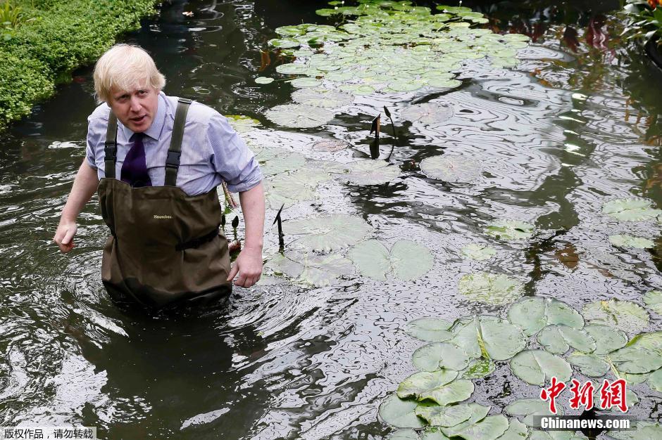 当地时间2015年3月16日,英国伦敦,伦敦市长鲍里斯亲自下水在伦敦皇家植物园种植睡莲。
