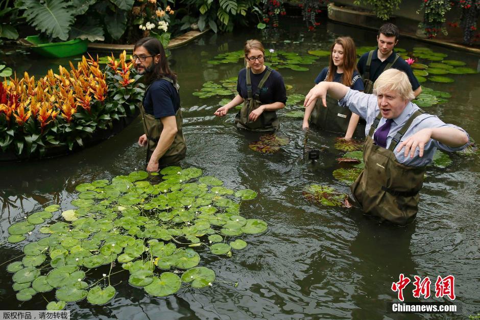当地时间2015年3月16日,英国伦敦,伦敦市长鲍里斯亲自下水在伦敦皇家植物园种植睡莲。