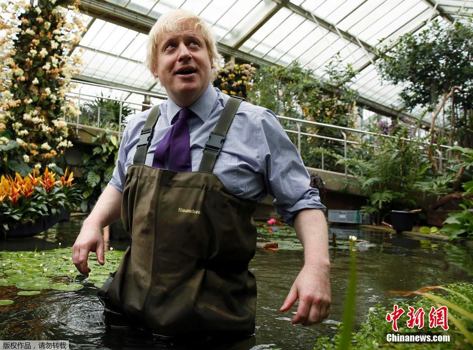 当地时间2015年3月16日,英国伦敦,伦敦市长鲍里斯亲自下水在伦敦皇家植物园种植睡莲。