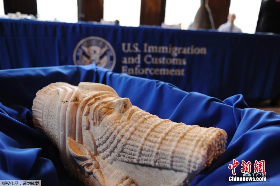 当地时间3月16日,美国华盛顿,美国将向伊拉克送还一批伊拉克文物,数量超过60件。这些文物被从伊拉克走私至美国,经过美国海关执法局的调查之后,决定归还伊拉克。图为一尊亚述帝国国王萨尔贡二世的雕像。