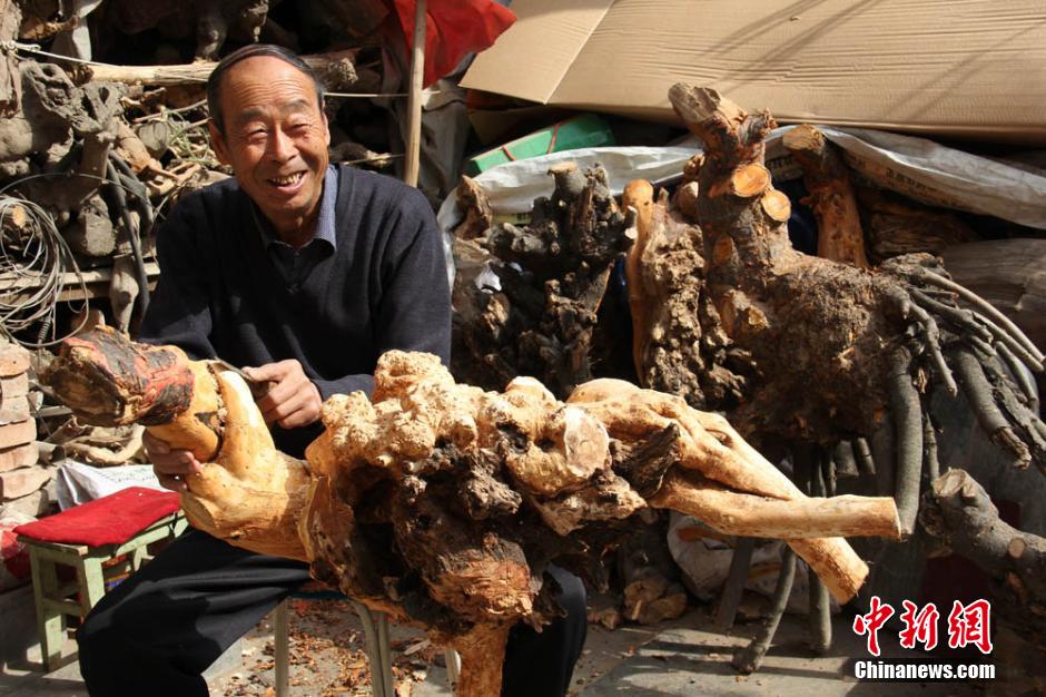 图为甘肃崇信县根雕艺人朱继国正在创新制作根雕。郭惠民 摄