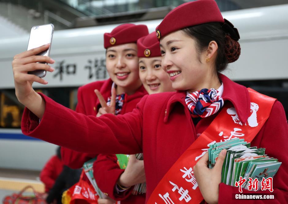 3月4日,福建铁路春运迎来节后返程客流高峰。3月5日是“学雷锋纪念日”,南昌铁路局福州客运段休班的动车乘务员姑娘们不顾春运带来的劳累,以实践雷锋精神为主题,来到福州火车站为返城旅客提供志愿服务,成为春运中一道靓丽风景线。雍万俊 摄