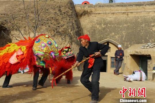 中新网甘肃庆阳3月4日电 (侯志雄 吕赟)“正月十五耍社火”元宵节前,在甘肃庆阳镇原县新城乡新城村浅俭自然村的窑洞前,一位老者手持自制绣球引逗着舞狮,用方言说唱着,这位年届78岁的村民王学功在当地“耍社火”已有30多年,是当地颇有名气的“社火头”。