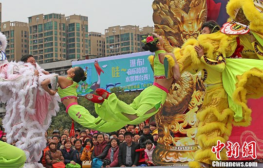 舞狮队向观众们展示绝技。李风 摄