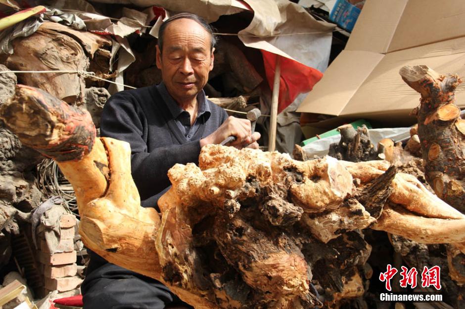 甘肃崇信县66岁的根雕艺人朱继国,6年来创新制作完成根艺精品300余件。从设计图纸到自己动手一步步雕刻制作,手锯、卷尺、刷子、刻刀等朱继国常握在手,精细的制作,丰富的内涵,加上有创意的造型,他的根艺作品保留传统文化的同时加入现代时尚元素。《灵龟》、《繁花似锦》、《贵人》、《中国龙》等多件作品被上海、广州、香港、澳门等地爱好者收藏;有三件作品漂洋过海,被土耳其、缅甸、马来西亚等外国根艺品爱好者购买收藏。朱继国说:“做大做强西北根艺产业,做更好更多的根艺精品,让崇信根雕精品走出平凉,走向全国,享誉海内外是我的梦想。”郭惠民 摄