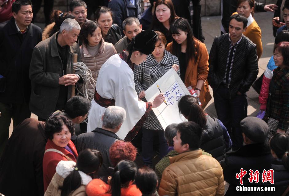3月6日,重庆观音桥步行街上一年轻小伙子穿着汉服表演书法,吸引不少市民围观。陈超 摄