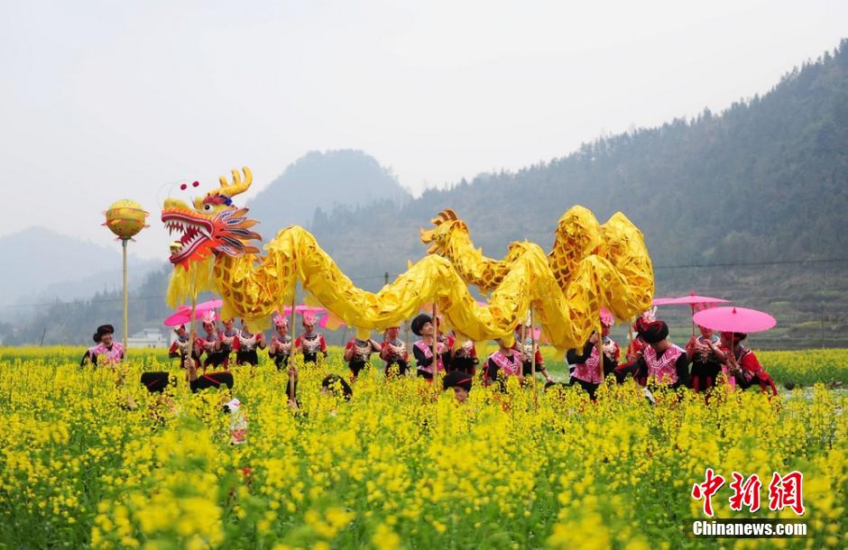 3月6日,身着盛装的苗族姑娘与舞龙队亮相湖南吉首的油菜花地。苗族男子们在菜地里挥舞着金龙,靓丽的苗家姑娘则跳起了“接龙舞”,以此迎接即将到来的“三八”妇女节。 杨华峰 摄