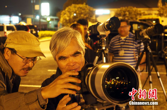 获得过普利策奖的著名摄影家黄功吾(左二)以及当地多名专业摄影师和摄影爱好者聚集一起拍摄。 中新社发 毛建军 摄
