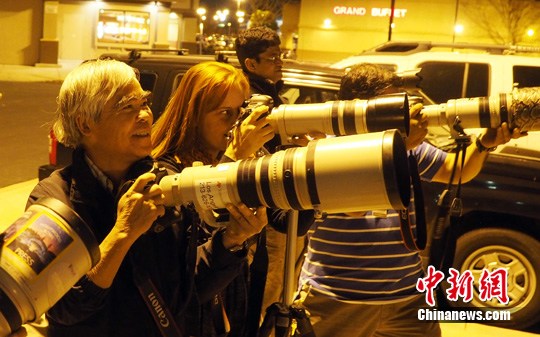 摄影爱好者们聚集一起拍摄元宵满月。 中新社发 毛建军 摄
