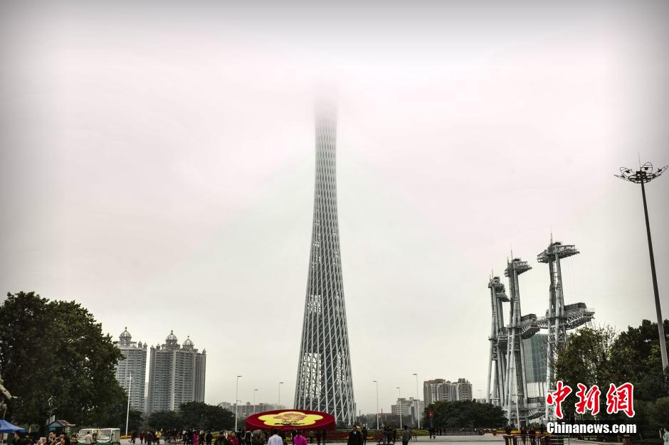 3月6日,广州塔塔顶被大雾笼罩。 中新社发 陈骥旻 摄