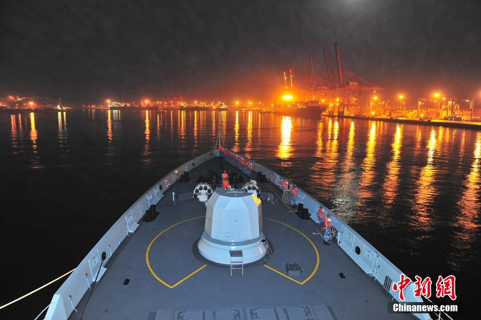 当地时间3月5日凌晨,海军第十九批护航编队临沂舰缓缓驶入阿曼苏丹国塞拉莱港,开始为期3天的靠港休整,这也是第十九批护航编队第三轮靠港补给休整。中新社发 熊利兵 摄