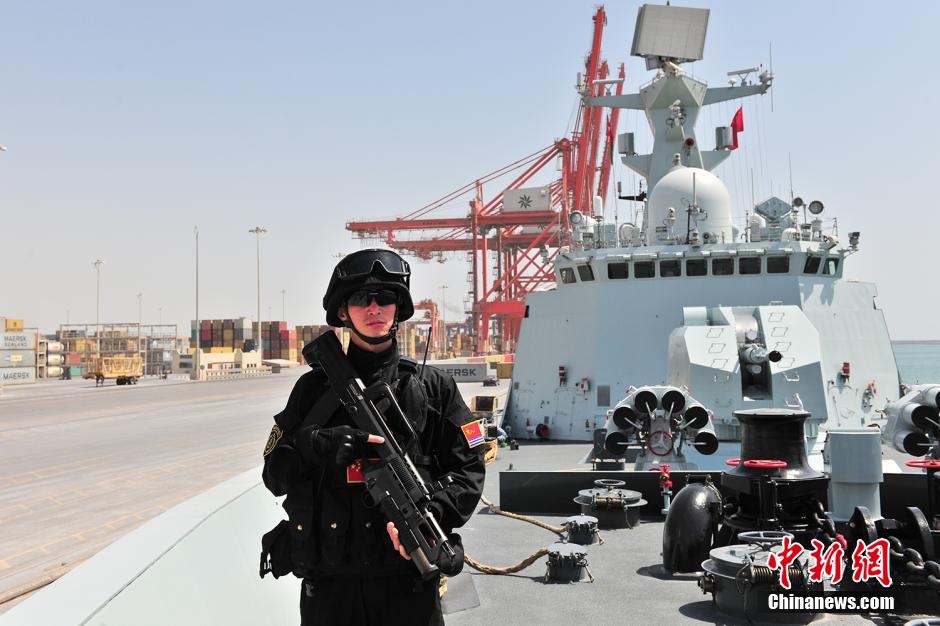 当地时间3月5日凌晨,海军第十九批护航编队临沂舰缓缓驶入阿曼苏丹国塞拉莱港,开始为期3天的靠港休整,这也是第十九批护航编队第三轮靠港补给休整。靠港休整期间,为确保人员和舰艇安全,特战队员24小时巡逻警戒。中新社发 熊利兵 摄