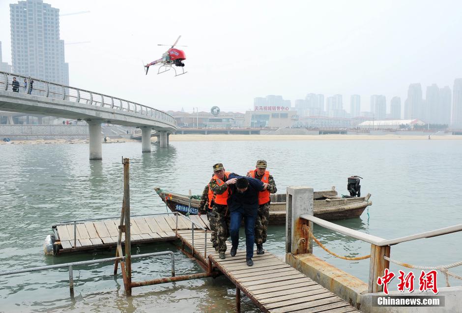 3月8日,烟台市经济技术开发区警方首次利用警用无人机进行治安防控演练,执行协查跟踪嫌疑车辆等4项任务。该无人直升机主桨直径超过两米,起飞重量可达32公斤,能够搭载高清摄像机等高科技侦查设备飞到千米高空。图为演练现场。 中新社发 任军 摄