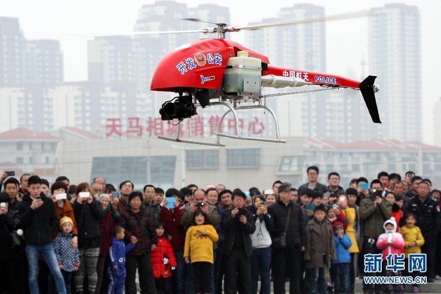 当日,山东省烟台市经济技术开发区举行警用无人机立体防控演练。演练所用HW-Z330警用无人直升机飞行高度可达2400米,巡航半径达25公里。此次演练旨在提高警用直升机快速反应、拉动配合、整体协作的水平,助力快速处置突发事件。新华社发 申吉忠 摄 图片来源:新华网