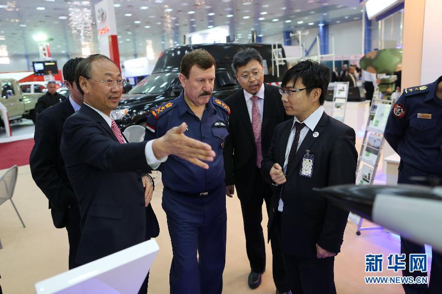 3月8日,在伊拉克首都巴格达的巴格达国际展览中心,中国保利科技有限公司副总经理于福珍(左一)向伊拉克空军总司令安瓦尔将军(左二)介绍保利公司的产品。当日,第四届伊拉克国际安全防务展在首都巴格达国际展览中心开幕,75家军工安防企业参展。新华社记者 陈序 摄 图片来源:新华网