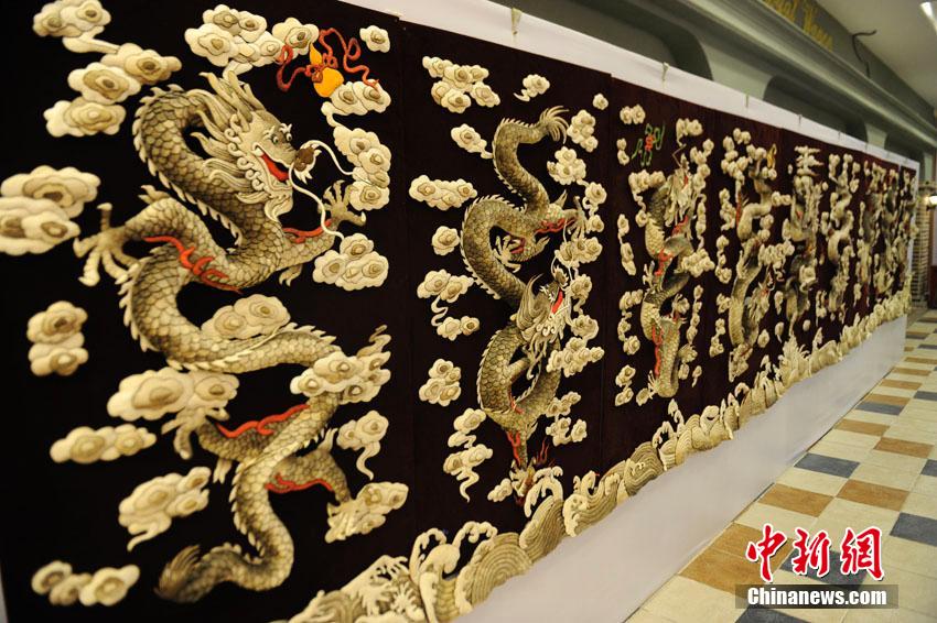 3月9日,一幅用鱼皮制作、图案为九龙的鱼皮壁画亮相长春,叫价180万元。据了解,鱼皮画高1.5米,长7.2米,采用精选的3888张鱼皮,由10名技师采用浮雕、刺绣、缝锁等技法耗时4998个小时制成。张瑶 摄