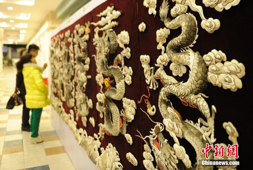 3月9日,一幅用鱼皮制作、图案为九龙的鱼皮壁画亮相长春,叫价180万元。张瑶 摄