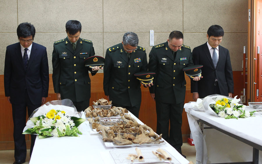 3月16日,在韩国坡州,中方人员向志愿军烈士遗骸致敬。新华社记者姚琪琳摄