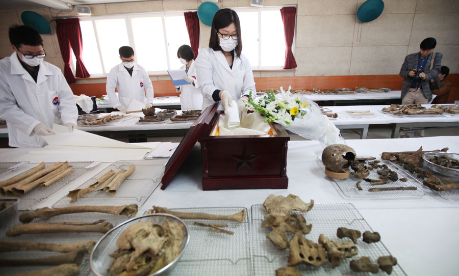 3月16日,在韩国坡州,韩方工作人员在装殓志愿军烈士遗骸。新华社记者姚琪琳摄