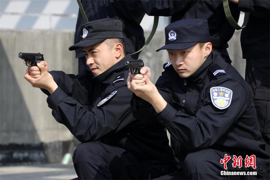 3月16日,江苏省常州市武进警方反恐防暴巡特警中队春训"亮剑"。据悉,这支反恐防暴队伍于今年2月成立,由12名民警和24名队员组成,清一色的都是“80后”和“90后”小伙子。此次“春训”将模拟实战场景,训练特警们警械使用、综合体技能、搏击、突击攻坚等课目。唐娟 摄