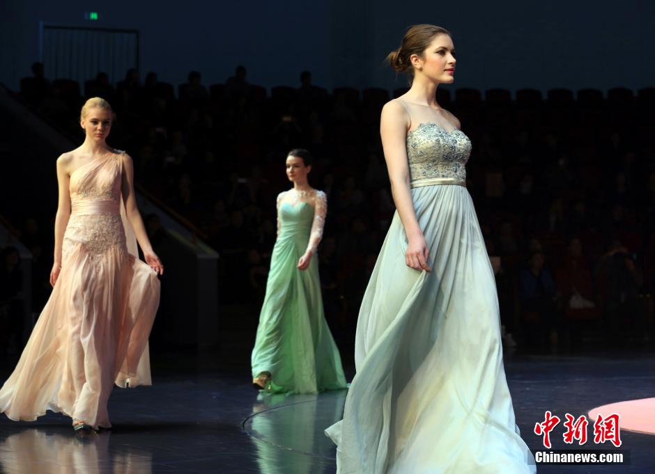 3月16日晚,2015上海国际服装文化节在eDressit定制礼服婚纱大秀中拉开帷幕。模特身着五大色系礼服,表现了五大洲女性的万种风情和美韵。此外,现场呈现的26国驻沪领事馆精挑细选的服饰慈善拍品,也演绎着华美礼服时尚与爱心的和谐融合。潘索菲 摄