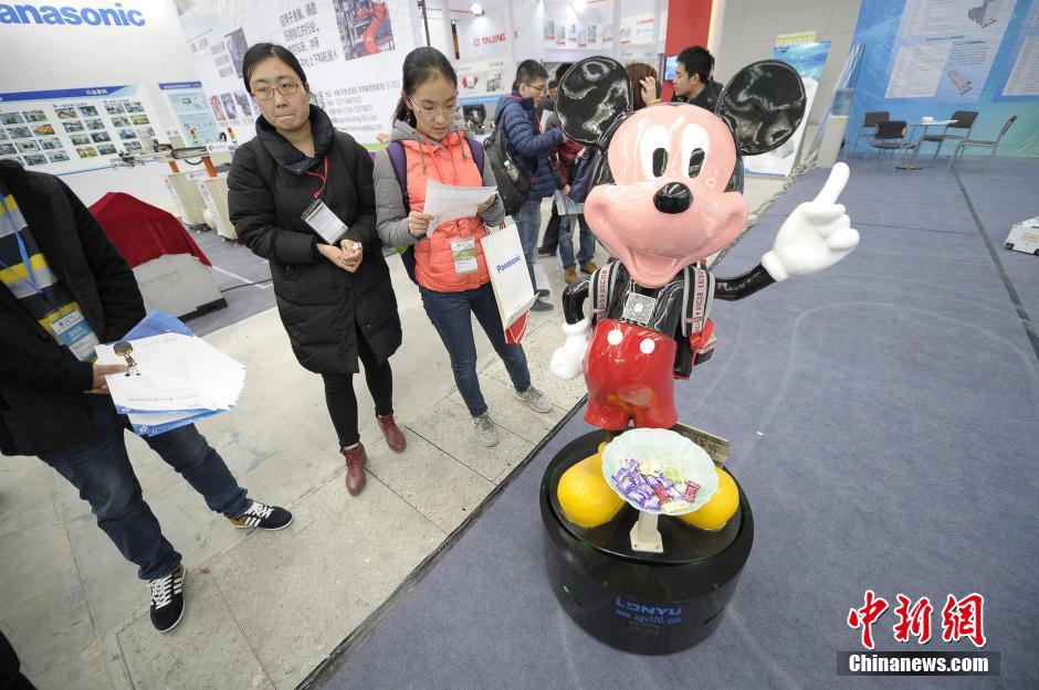 3月12日,观众在观看智能送餐机器人。中新社发 佟郁 摄
