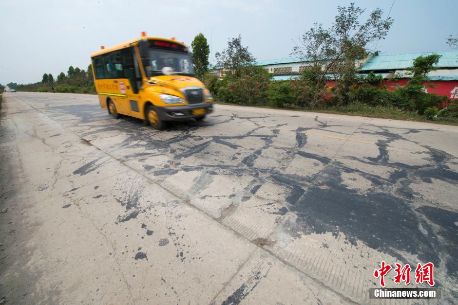 3月13日,一辆校车正在海榆西线铺仔、西培一带路段的“纹身”公路上行驶。中新社发 骆云飞 摄