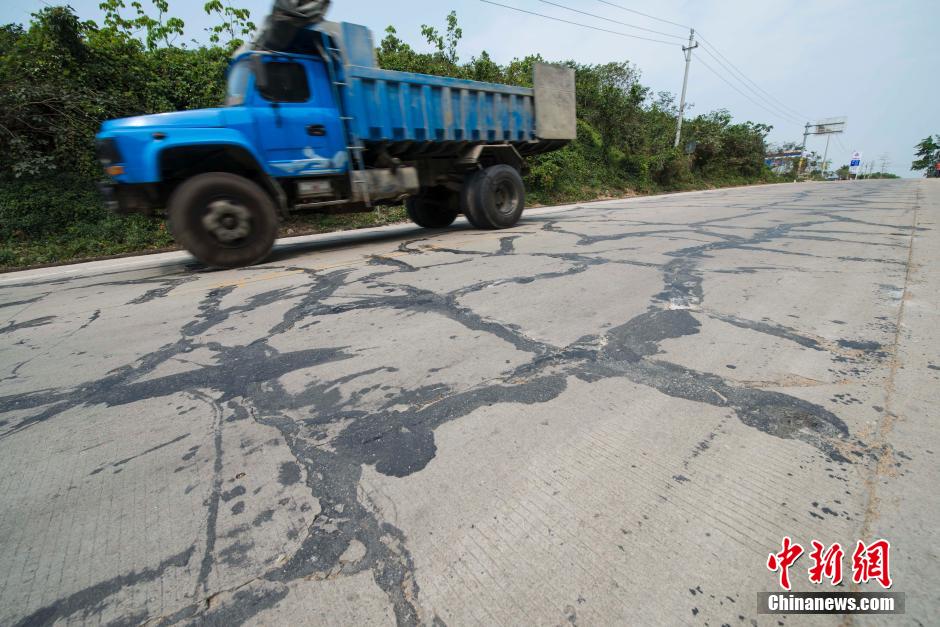 3月13日,一辆重型卡车正在海榆西线铺仔、西培一带路段的“纹身”公路上行驶。中新社发 骆云飞 摄