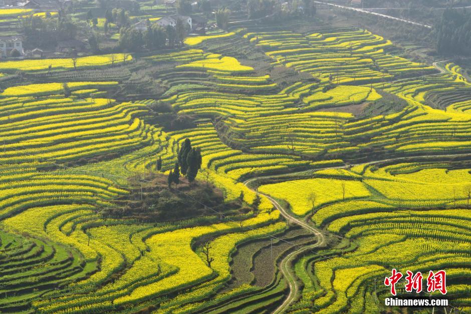 阳春三月,贵州省遵义市余庆县大乌江镇红渡村梯田中的油菜花竞相开放,层层叠叠的梯田形成一幅美丽的画卷,吸引了众多游客和摄影爱好者。图为3月14日拍摄油菜花梯田。中新社发 贺春雨 摄