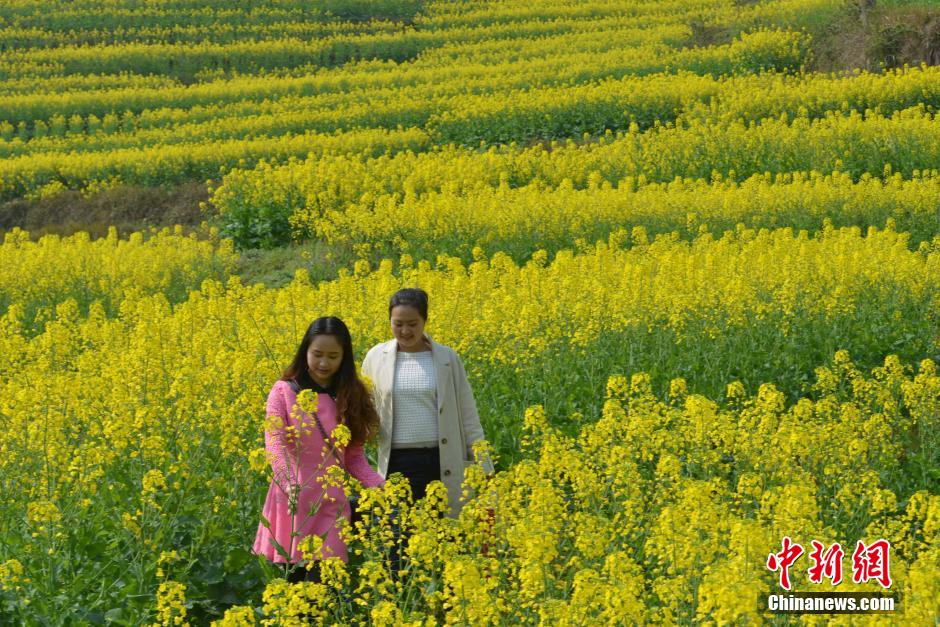阳春三月,贵州省遵义市余庆县大乌江镇红渡村梯田中的油菜花竞相开放,层层叠叠的梯田形成一幅美丽的画卷,吸引了众多游客和摄影爱好者。图为3月14日,游客在油菜花中穿行。中新社发 贺春雨 摄