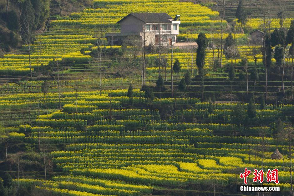 阳春三月,贵州省遵义市余庆县大乌江镇红渡村梯田中的油菜花竞相开放,层层叠叠的梯田形成一幅美丽的画卷,吸引了众多游客和摄影爱好者。图为3月14日拍摄油菜花梯田。中新社发 贺春雨 摄