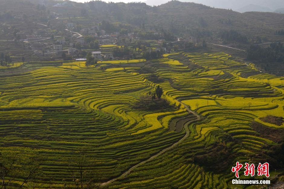 阳春三月,贵州省遵义市余庆县大乌江镇红渡村梯田中的油菜花竞相开放,层层叠叠的梯田形成一幅美丽的画卷,吸引了众多游客和摄影爱好者。图为3月14日拍摄油菜花梯田。中新社发 贺春雨 摄