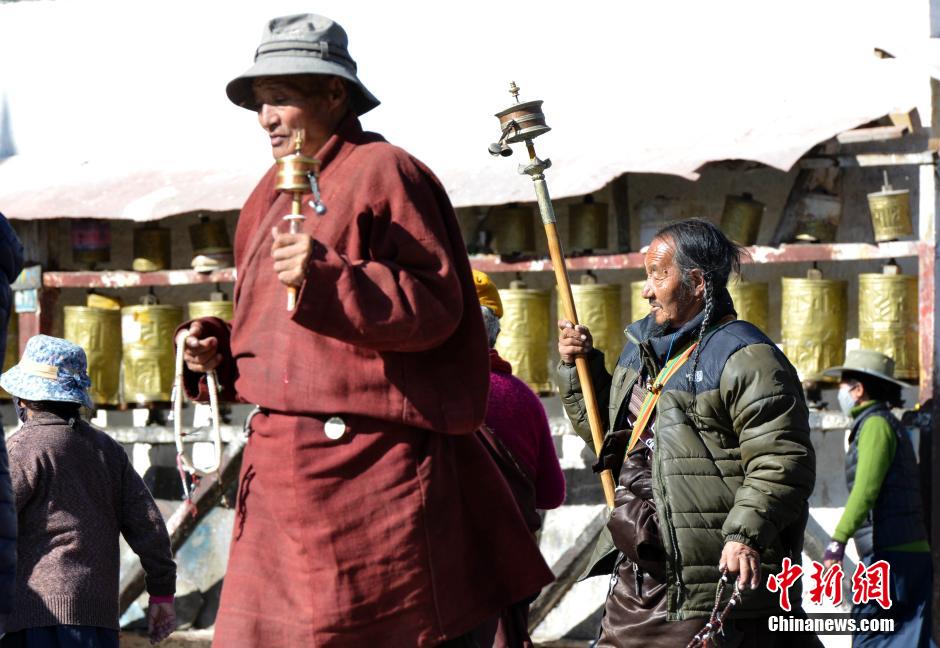 3月14日,藏族信教民众在拉萨老城区八廓街转经。中新社发 李林 摄