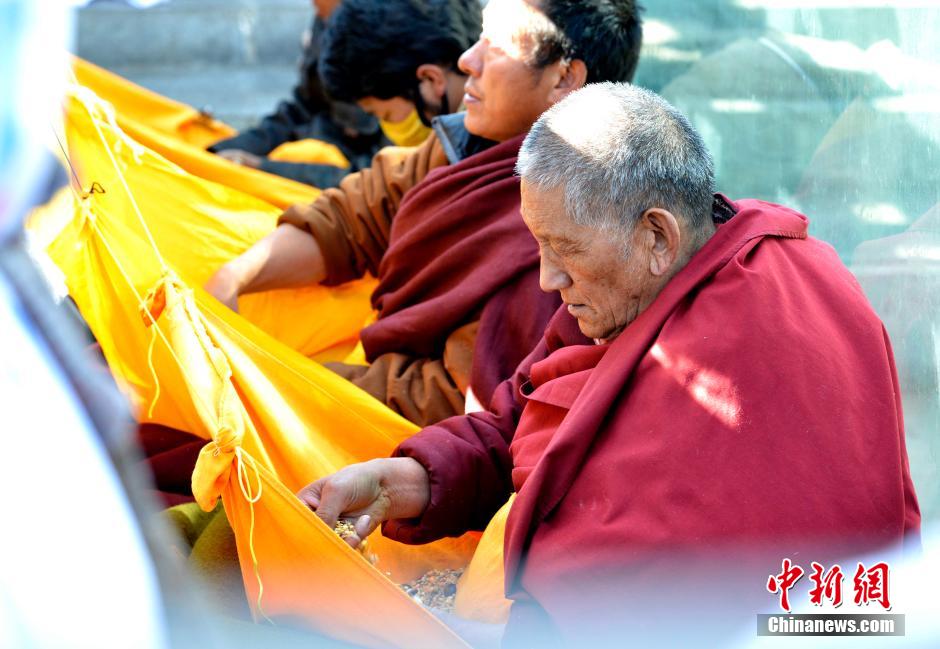 3月14日,僧俗信众在拉萨大昭寺前虔诚朝佛。中新社发 李林 摄
