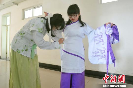 同学间互相帮忙穿好汉服 李传平 摄