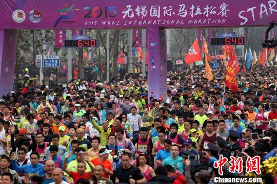 3月15日,2015无锡国际马拉松赛在无锡太湖大道鸣枪开赛。3万名来自国内外的跑友参加了全程马拉松(42.195公里)、半程马拉松和迷你马拉松项目的角逐,其中全程和半程的参赛人数达到2万人,参赛选手们在被称为“国内最美风景马拉松赛道”中享受跑步带来的乐趣。