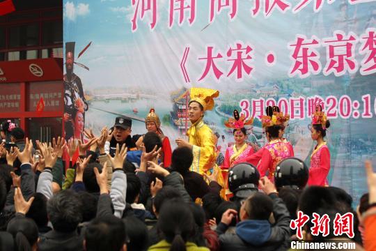 3月15日,郑州国际会展中心一场规模宏大的婚博会正在举行,清明上河园展台上“宋徽宗”带领5名嫔妃佳丽现身会场,向蜂拥围观的市民及准新人发放数百红包,内含河南文化名片《大宋·东京梦华》门票一张,邀大家3月20日到清明上河园共享《大宋·东京梦华》视听盛宴。随后,他们又在展馆内逗留,到婚纱影楼展区试婚纱,到珠宝展区挑钻戒,现场引民众一路尾随看稀罕并索要红包沾喜气。