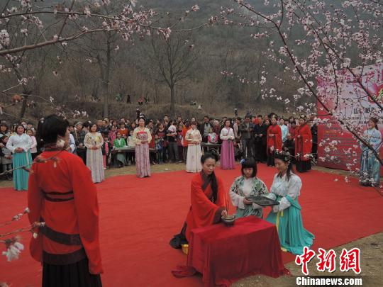 女子遵循古礼在桃花树前上香祭拜花神祈福 韩章云 摄