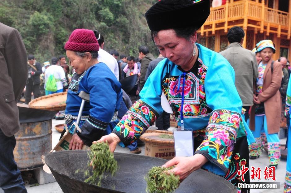 3月16日,湖南保靖县在葫芦镇黄金村举办保靖黄金茶炒茶王争霸赛。40位少数民族炒茶师在40口大锅里现炒茶叶,争夺“保靖黄金茶炒茶王”称号。 彭司进 摄