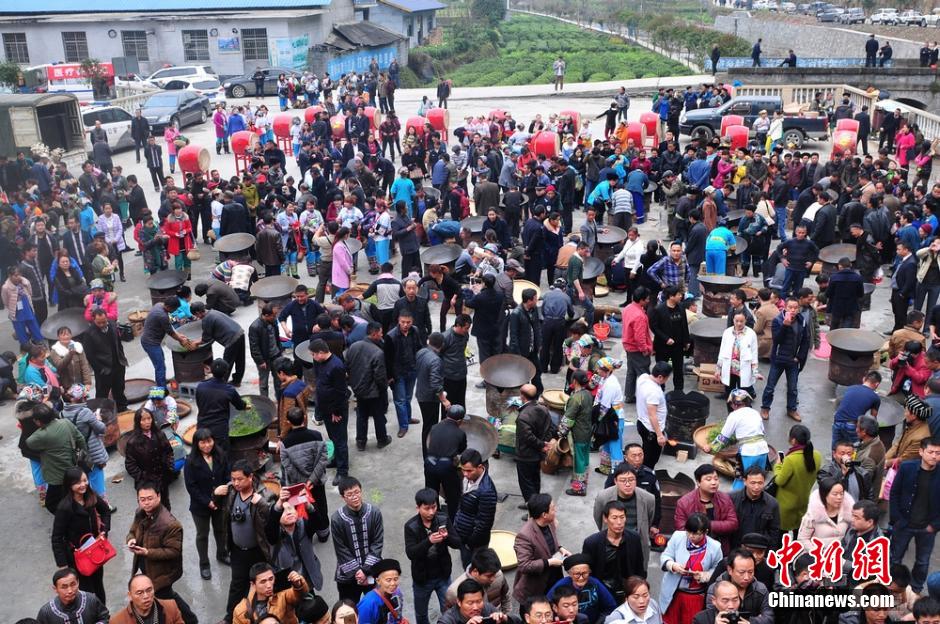 3月16日,湖南保靖县在葫芦镇黄金村举办保靖黄金茶炒茶王争霸赛。40位少数民族炒茶师在40口大锅里现炒茶叶,争夺“保靖黄金茶炒茶王”称号。 彭司进 摄