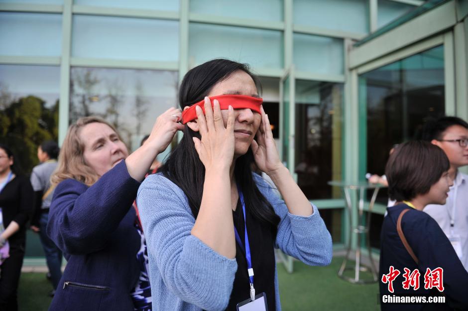 3月16日,参加活动的嘉宾在进行身障体验。中新社发 刘冉阳 摄