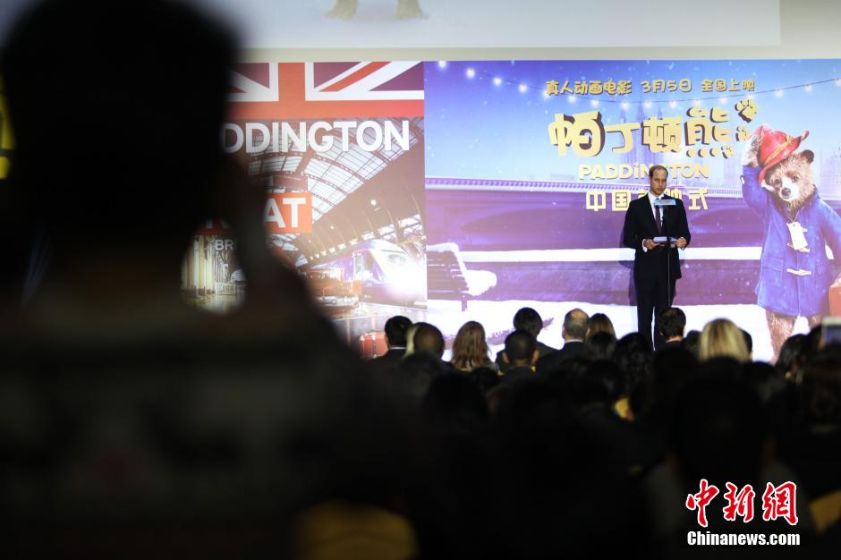 3月3日下午,剑桥公爵威廉王子现身上海电影博物馆,助阵真人动画喜剧电影《帕丁顿熊》中国首映。在仪式上,威廉王子向中国观众隆重推荐这只风靡全球的英国萌宠,旨在推广中英两国的文化交流活动。中新社发 张亨伟 摄