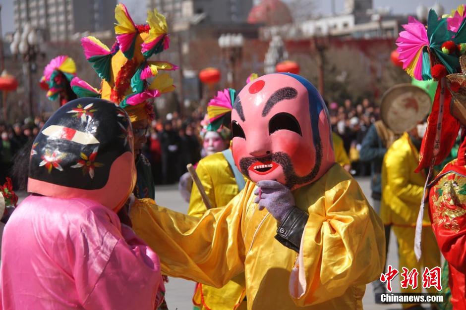 3月3日,中国农历正月十三,张掖甘州区安阳乡社火队在表演传统社火。当日,来自甘州区7个乡镇的社火队在张掖城区中心广场进行表演,近千名队员上演扭秧歌、舞龙舞狮、划旱船等民间社火节目,表演内容多取材于神话、历史演义或民间传说故事,有着鲜明的地域文化特色,将羊年春节庆祝活动推向高潮,迎接即将到来的正月十五元宵节。陈礼 摄
