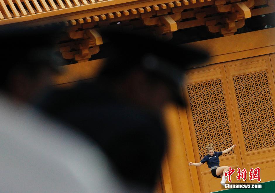 3月13日,2015年FINA世界跳水系列赛北京站比赛在北京国家游泳中心开赛,一位选手在中国味浓厚的装置前训练。中新社发 刘关关 摄