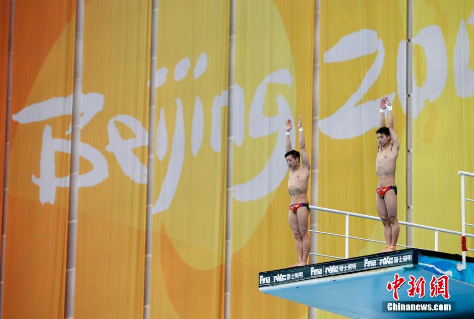 3月13日,在北京国家游泳中心举行的2015年FINA世界跳水系列赛北京站男子双人10米跳台决赛中,中国选手陈艾森/林跃以486.75分夺冠。中新社发 韩海丹 摄