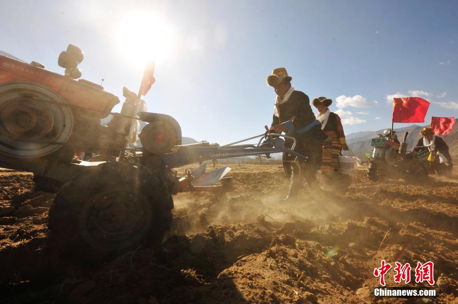 3月16日,拉萨市堆龙德庆县古荣乡加入村村民用手扶拖拉机举行春耕仪式。当日是藏历元月26,根据藏族天文历算,当日是一个适合春耕春播的良辰吉日,西藏多地农牧民按照延续数百年的传统,纷纷以不同形式举行春耕仪式。中新社发 唐朝杨 摄