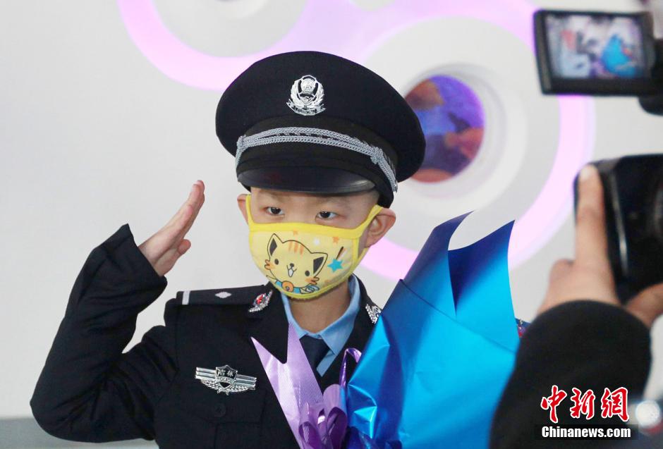 3月16日,在吉林大学白求恩第一医院小儿血液科活动室内,来自社会各界的爱心人士为8岁的白血病患儿刘梓曦圆警察梦。据了解,刘梓曦是一名急性淋巴细胞白血病患者,年仅8岁。这个正在与病魔缠斗的孩子有个梦想,当一名警察,维护正义。孩子的愿望经当地媒体报道后,得到了吉林市警方的支持。吉林市公安局专门为刘梓曦量身定制了一套警服,并由专人从吉林市带到长春的医院内。当天,医院与警方联合为刘梓曦举行了一场庄重的“就职仪式”。中新社发 张瑶 摄