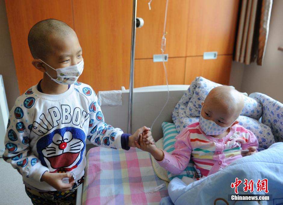 3月16日,在吉林大学白求恩第一医院小儿血液科活动室内,来自社会各界的爱心人士为8岁的白血病患儿刘梓曦圆警察梦。据了解,刘梓曦是一名急性淋巴细胞白血病患者,年仅8岁。这个正在与病魔缠斗的孩子有个梦想,当一名警察,维护正义。孩子的愿望经当地媒体报道后,得到了吉林市警方的支持。吉林市公安局专门为刘梓曦量身定制了一套警服,并由专人从吉林市带到长春的医院内。当天,医院与警方联合为刘梓曦举行了一场庄重的“就职仪式”。图为刘梓曦给临床小病友加油鼓劲。中新社发 张瑶 摄