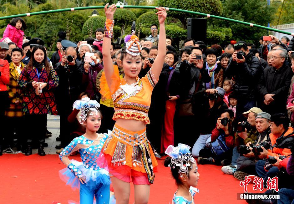 3月1日,2015年海峡两岸民俗文化节在福州南江滨公园九龙壁启幕。当天,两岸近2000名民俗艺人汇聚福州,以民俗风情展演与踩街、传统美食体验、传统手工技艺互动展示等方式,各展绝活,联袂演绎两岸民俗文化的丰富多彩。本届文化节吸引了台湾高雄如真园掌中剧团、台湾美浓油纸伞、台湾传统银饰、台湾立体刺绣等前来,成为历届海峡两岸民俗文化节中,参与台湾队伍最多的一次。图为福州连江县演员带来《东岱钱棍舞》精彩表演。刘可耕 摄